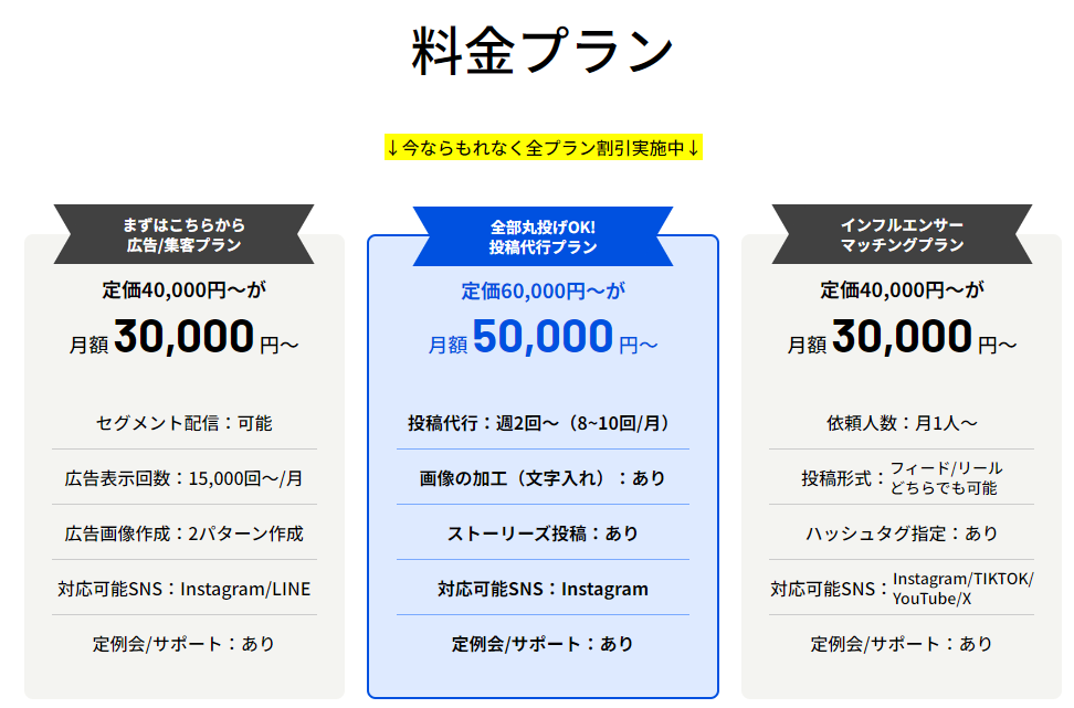 「SNS運用ドットコム」では、運用を一元的にお任せいただけるプランのほか、広告運用やインフルエンサーマッチングのプランなど、ニーズに沿って選べる3つのプランを設けています。